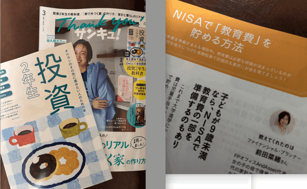 【メディア掲載】2026年3月号サンキュ!さん記事が掲載されました 2026年1月29日 メディア掲載 2026年3月号(1月23日発売)のサンキュ!別冊付録の「投資2年生」で「NISAで教育費を貯める方法」監修させていただきました。
