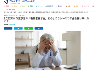 • 【メディア掲載】ファイナンシャルフィールド「2022年に改正予定の「在職老齢年金」どのようなケースで年金を受け取れない?」