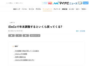 • 【メディア掲載】マイナビニュース「iDeCoで年末調整するといくら戻ってくる?」