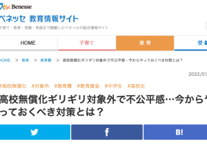 • 【メディア掲載】ベネッセ教育情報サイト「高校無償化ギリギリ対象外で不公平感…今からやっておくべき対策とは?」