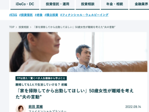 • 【メディア掲載】finasee 「家を掃除してから出勤してほしい」50歳女性が離婚を考えた“夫の言動”