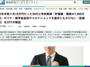 • 【メディア掲載】資産形成ゴールドオンライン「新卒手取り月19万円だった30代小学校教師「貯蓄額・驚異の7,000万円」